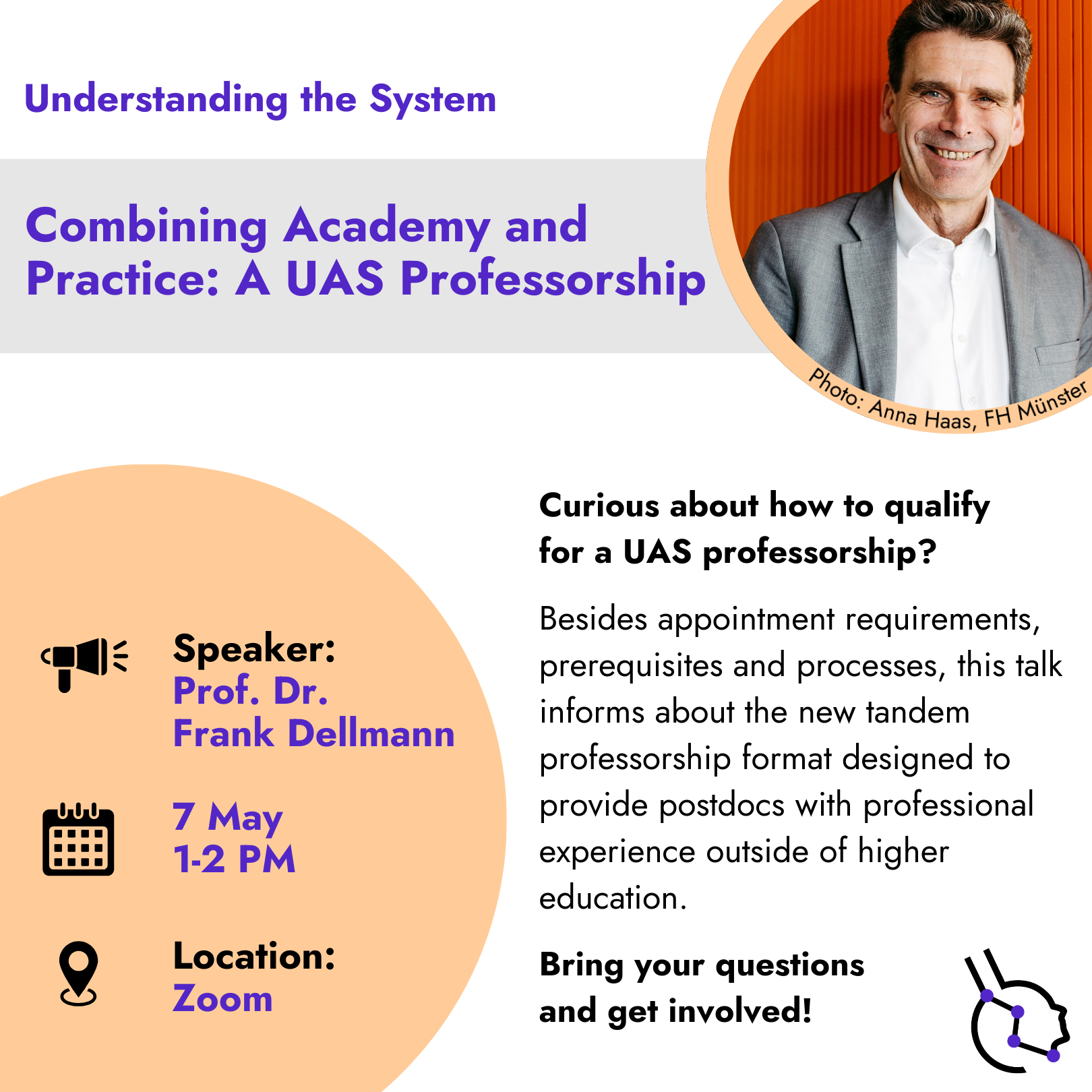 In this virtual lunch talk, Frank Dellmann introduces you to Universities of Applied Sciences (UAS)— the most common type of university in Germany in term of numbers. He will discuss professorship appointment requirements, prerequisites and processes, and present a new format called tandem professorship (in German ‘Tandemprofessur’ or ‘Nachwuchsprofessur’). This format is designed to provide postdocs with professional experience outside of higher education in order to meet the requirements for a UAS professorship. Bring your questions and get involved!